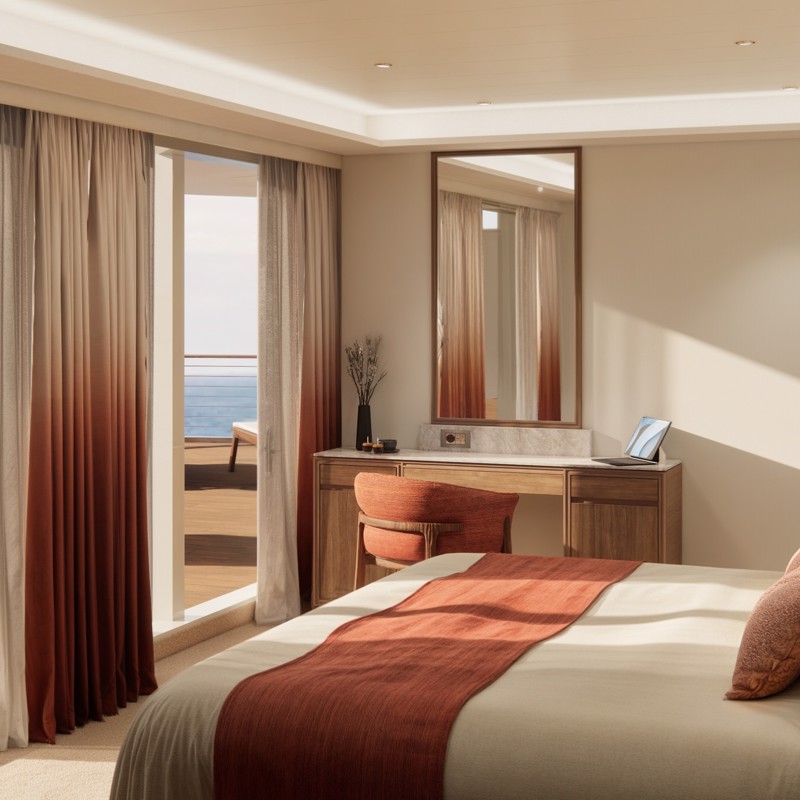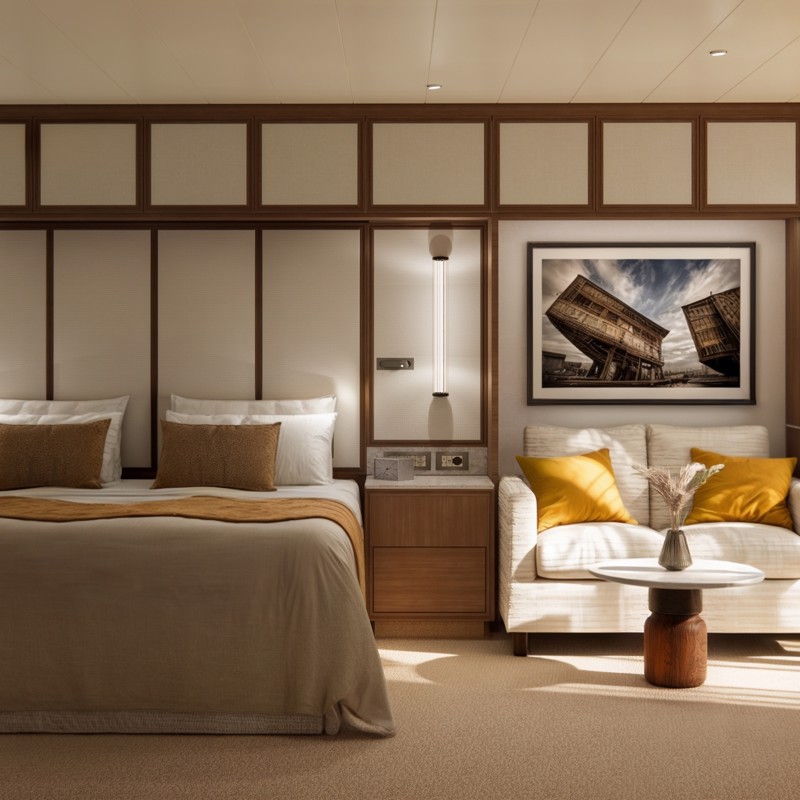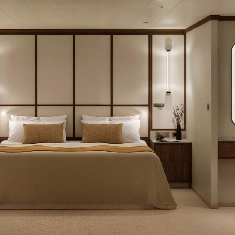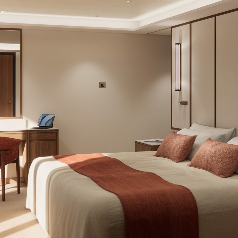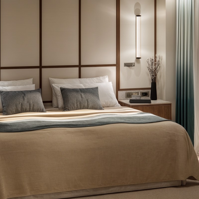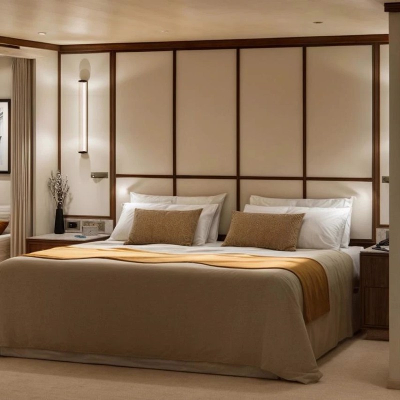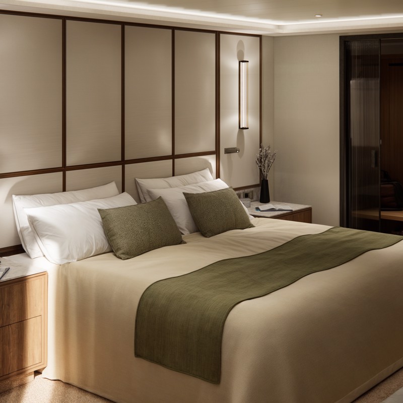 - Master bedroom with king-size bed or twin beds, large walk-in closets, and a TV that discreetly retracts into the ceiling when not in use