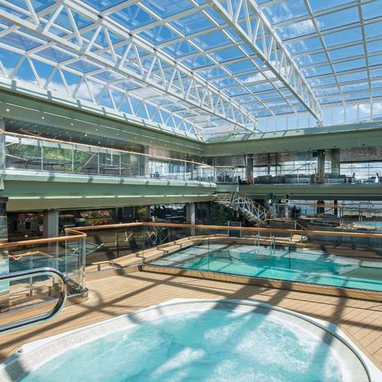 Sitting under a glass roof, flanked by whirlpools and sun loungers, this pool is the perfect place to spend an afternoon – whether it’s sunny outside or hammering it down with rain, you’ll be able to enjoy a soak while at sea.