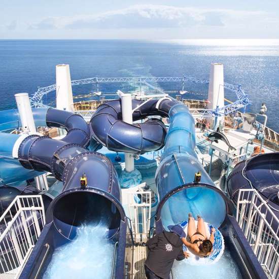 Both little ones and big kids will have a great time in the onboard aquapark, which features three slides, drench buckets, and spray guns. -